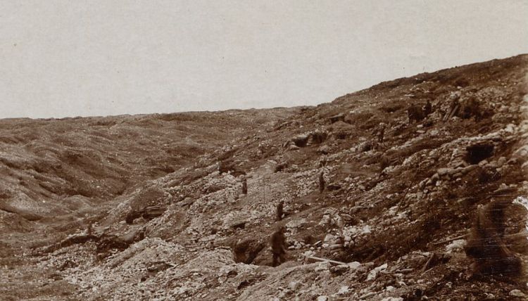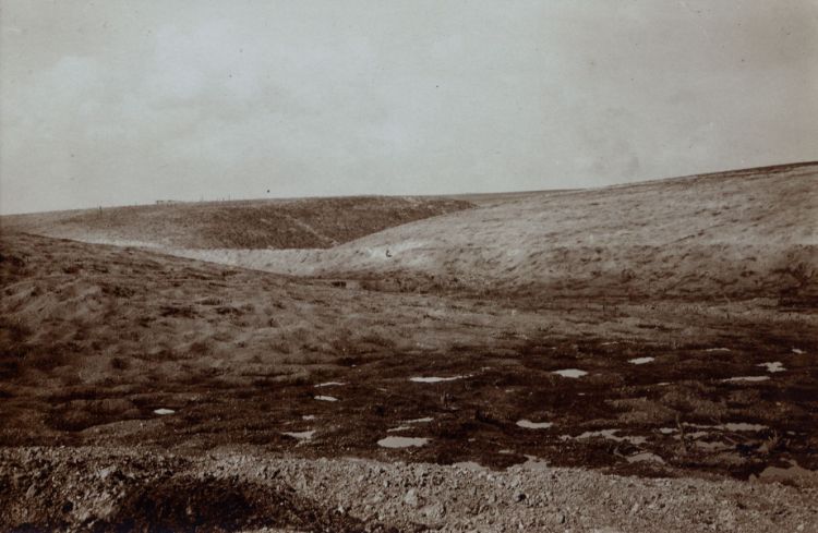 Above: A German Soldiers photo of the remains of the village of Vaux. The line going diagonally down the hill on the left must be the Ravin des Grandes Houyers. I think Vaux Teich must have been to the photographers left, Fort Vaux behind his right shoulder