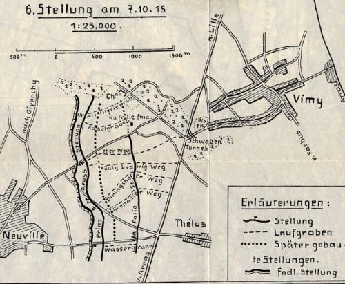 The 2. bayerische Division had moved from their positions to the west of Peronne to take up position to the west of Vimy on the 7th of October. The 12. bay. Infanterie Regiment was to the Northeast of Neuville in the Prinz Reuss Stellung. They had missed the main part of the battle, the slaughter of late September, but were in position to face the next French attack. From the 7th to the 10th of October they were under heavy artillery and Minenwerfer fire. In some sectors the French infantry were only 30m away and as a result the men in the front line were also under rifle grenade fire. Life in the front line consisted of waiting for the enemy attack, praying that no shell would land on you... and when it got dark, trying to rebuild some of the defensive positions. The 6. Komp would have been in position in the front line on the level of the Artilleriegraben. The attack was from West to East on the map below.