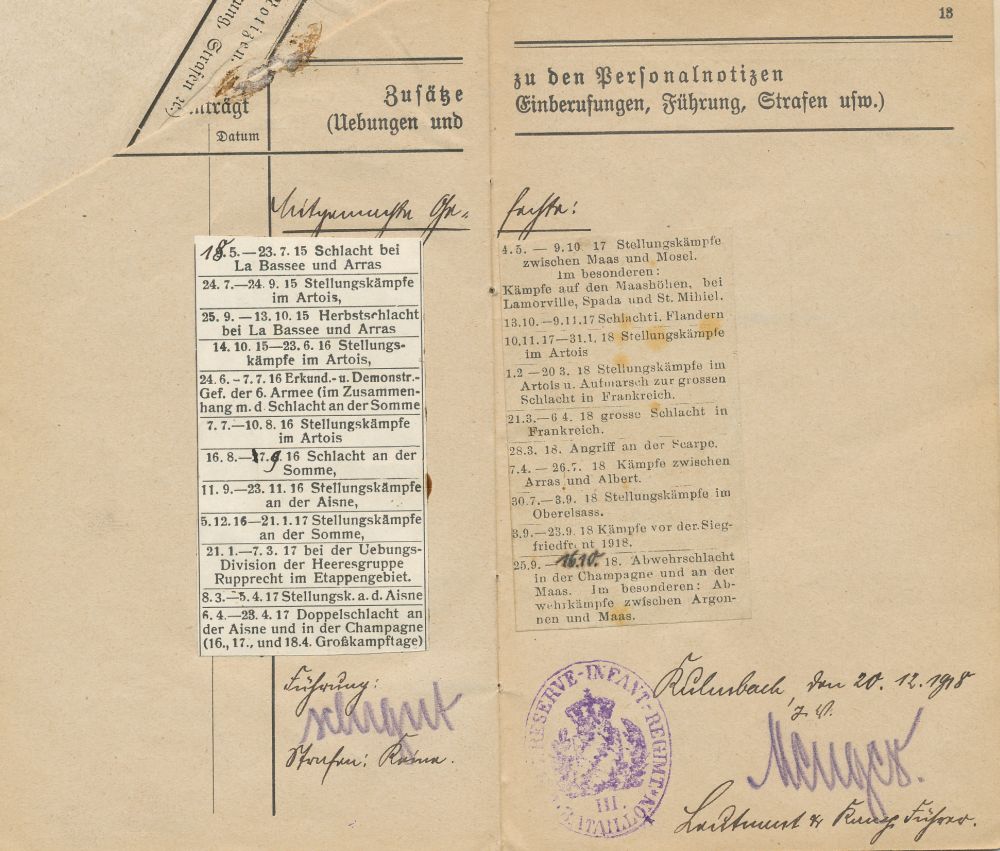 Above: The Militärpass of Landsturmmann (later Gefreiter) Heinrich Grieshammer. The entry for the Bavarian Golden Bravery Medal is marked in green