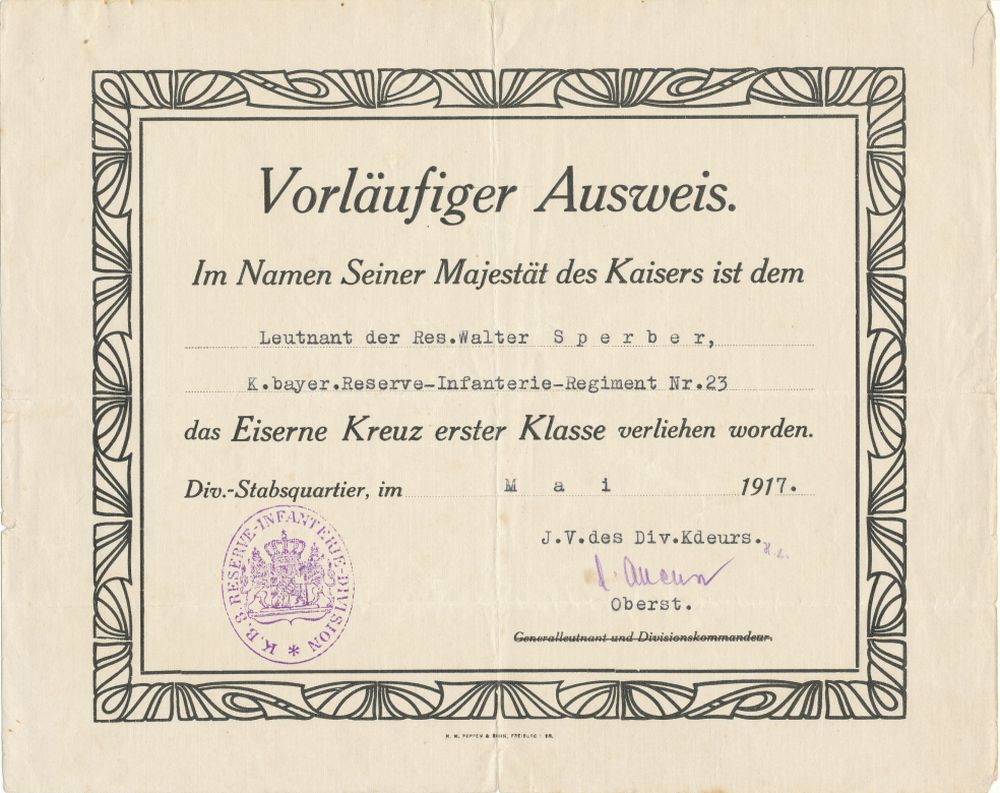 signed in May 1917 in Vertretung des Divisions Kommandeurs (on behalf of the